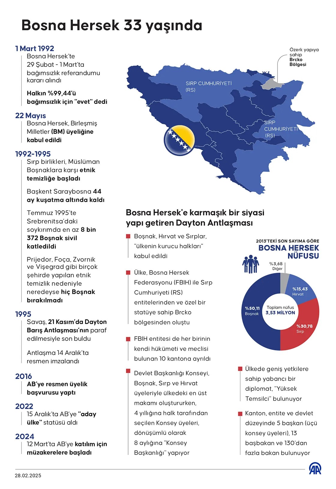 Eşsiz bir coğrafyaya ve zengin kaynaklara sahip olan, nüfusunun yarısından fazlasını Müslüman Boşnakların oluşturduğu Bosna Hersek'te, bağımsızlığın 33'üncü yılında dahi 1992-1995'teki savaşın acı hatıraları canlılığını koruyor.