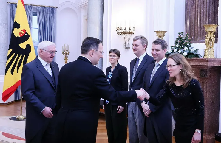 Bellevue Sarayı'nda gerçekleştirilen kabulde, Büyükelçi Turan, Cumhurbaşkanı Steinmeier ile sıcak bir karşılamanın ardından güven mektubunu takdim etti.