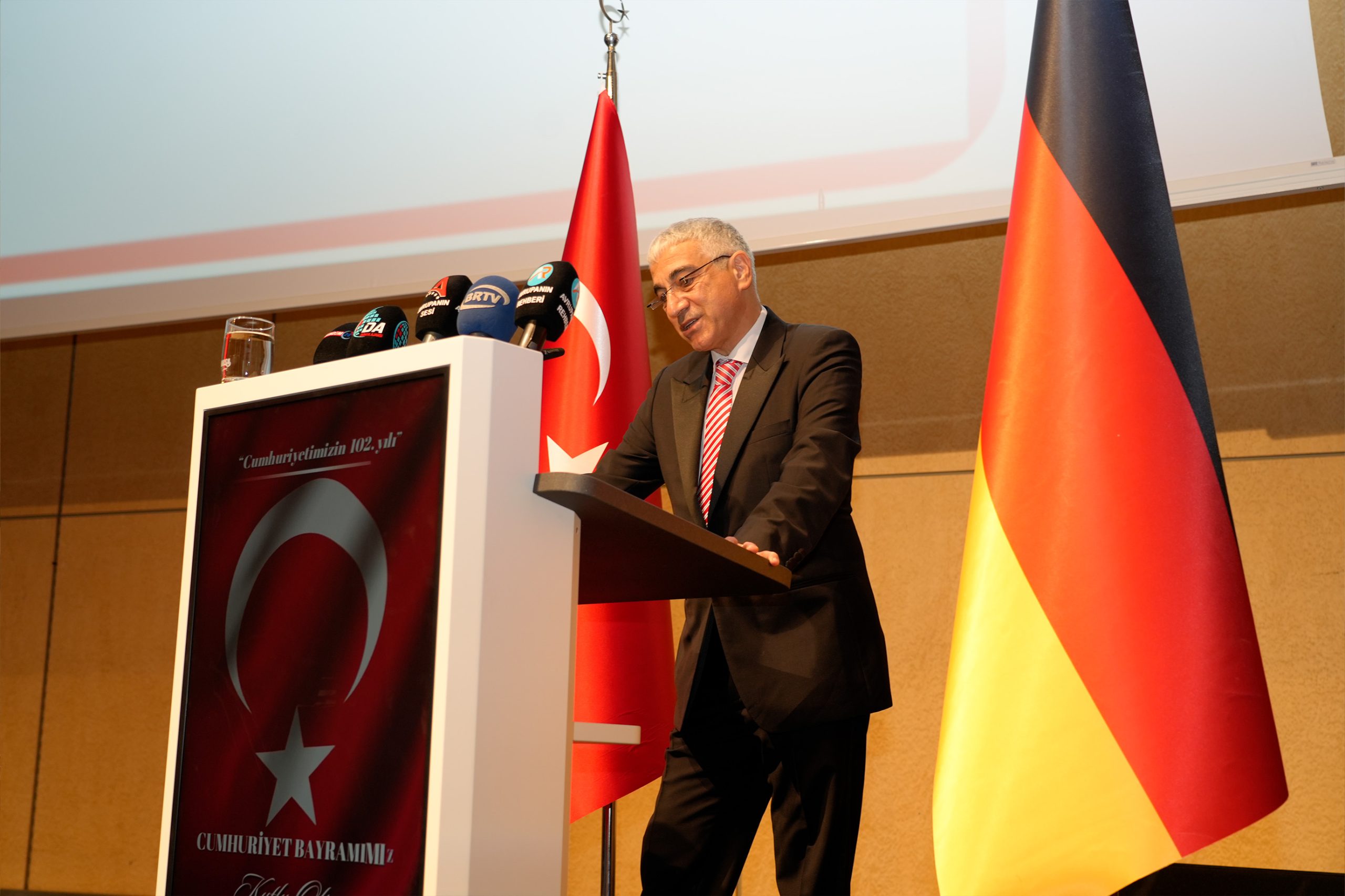 Kutlama programı, Türk ve Alman milli marşlarının okunmasıyla başladı. Ardından Türkiye Cumhuriyeti Münster Başkonsolosu Mehmet Özgün Arman, yaptığı konuşmada Cumhuriyet’in Türk milleti için taşıdığı önemi vurguladı ve birlik, beraberlik mesajı verdi.