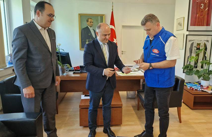 Başkonsolos Aydın, bağışını Türkiye'deki deprem bölgesinde kesilmek üzere, makbuz karşılığında DİTİB aracılığıyla gerçekleştirdi.