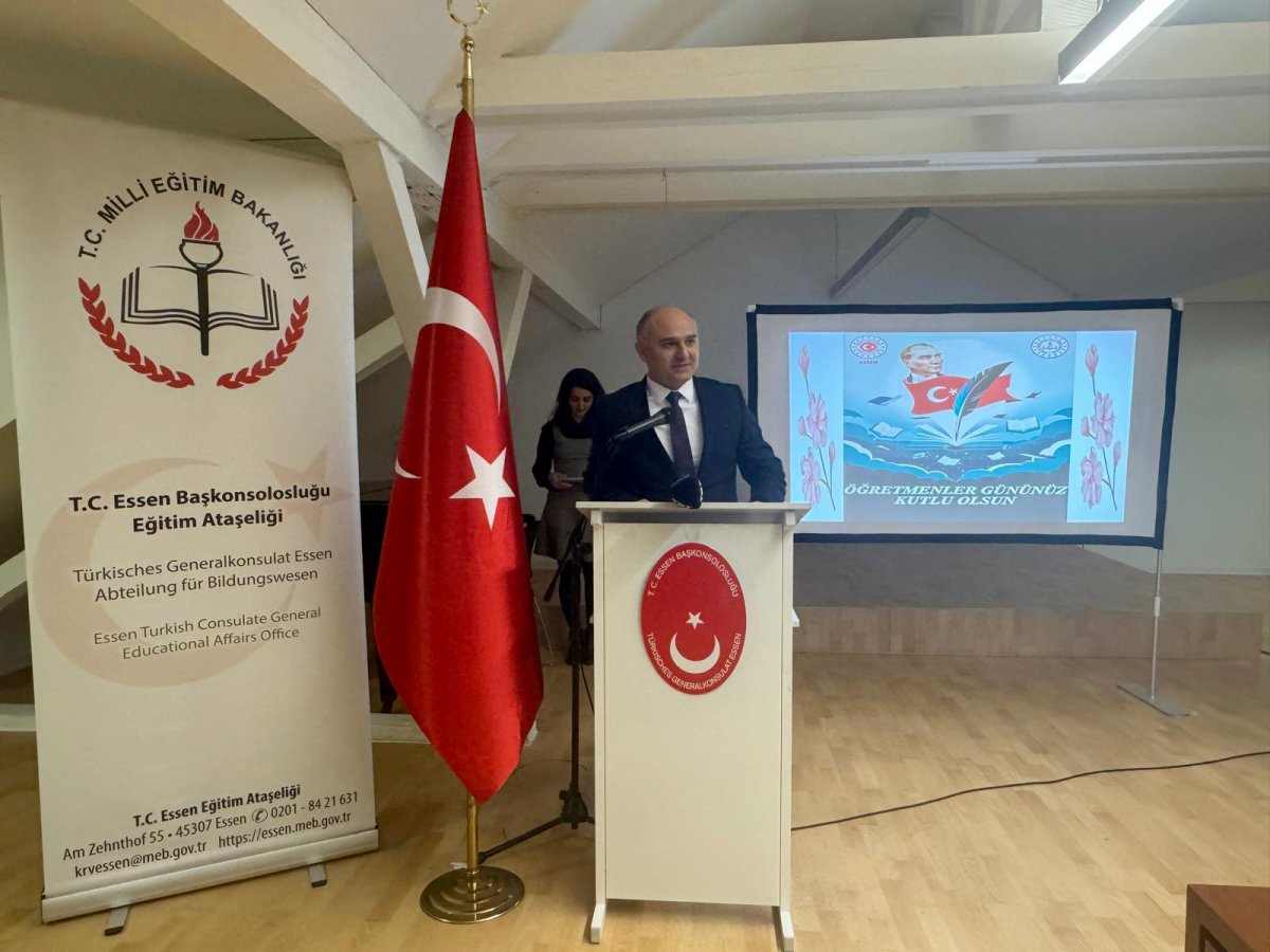 Program, öğretmen Tugçe Aslan’ın sunumuyla başladı. Saygı duruşu ve İstiklal Marşı’nın okunmasının ardından, öğretmen Enise Demir, Modern Yabancı Diller Öğretmenler Derneği Başkan Yardımcısı Yavuz Kılıç, KRV Türk Öğretmenler Derneği Başkanı Ayla Erfidan, Ruhr Öğretmenler Derneği Başkanı Ferhan Tan, Eğitim Ataşesi Sabri Yolcu ve Başkonsolos Taylan Özgür Aydın günün anlam ve önemine ilişkin konuşmalar yaptı.