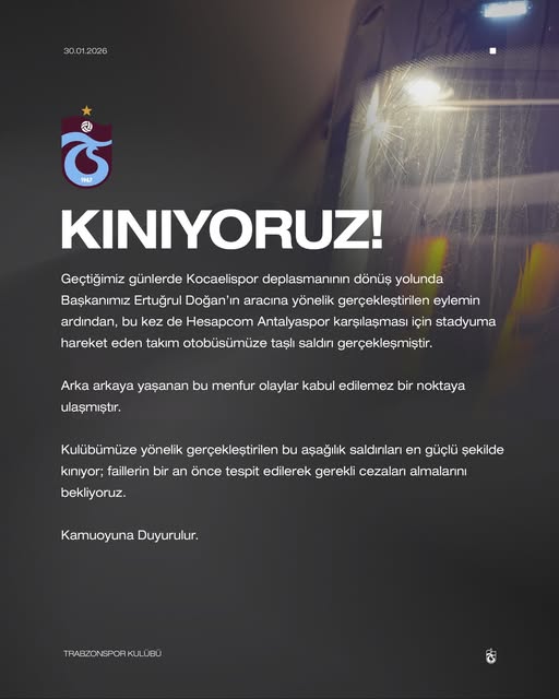 👉 WhatsApp Kanalına KatılTrabzonspor Kulübü, yaşanan olayın ardından sosyal medya hesapları üzerinden bir açıklama yaparak saldırıyı kınadı. Açıklamada, takım otobüsünün stadyuma hareket ettiği sırada taşlı saldırının gerçekleştiği bildirildi.