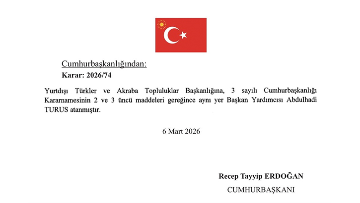 Cumhurbaşkanlığı’nın 2026/24 sayılı kararıyla yapılan atamaya göre, 3 sayılı Cumhurbaşkanlığı Kararnamesi’nin 2 ve 3’üncü maddeleri gereğince YTB Başkan Yardımcısı olarak görev yapan Abdulhadi Turus, Yurtdışı Türkler ve Akraba Topluluklar Başkanlığı görevine getirildi.