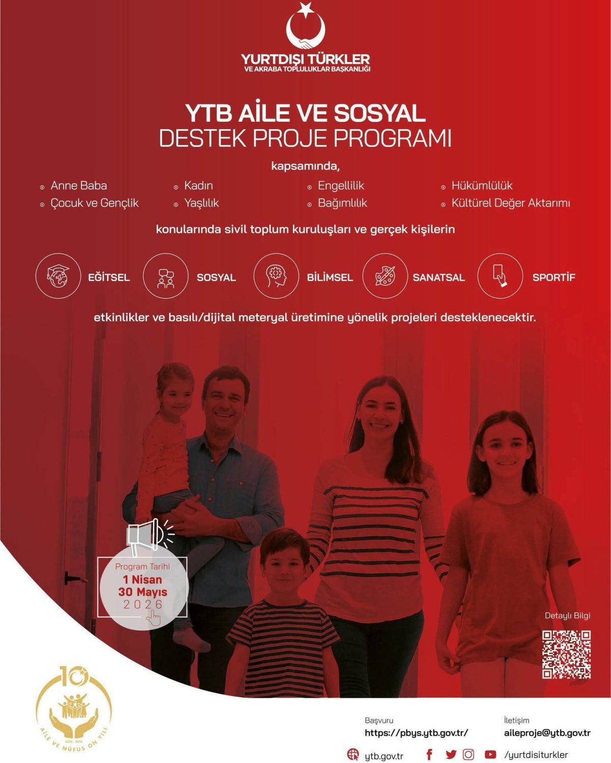 Yurtdışı Türkler ve Akraba Topluluklar Başkanlığı (YTB), yurt dışında yaşayan Türk toplumunun aile yapısını güçlendirmek ve dezavantajlı bireylere yönelik sosyal destekleri artırmak amacıyla Aile ve Sosyal Destek Proje Programını hayata geçirdi. Program kapsamında başvurular 1 Nisan – 30 Mayıs 2026 tarihleri arasında alınacak.