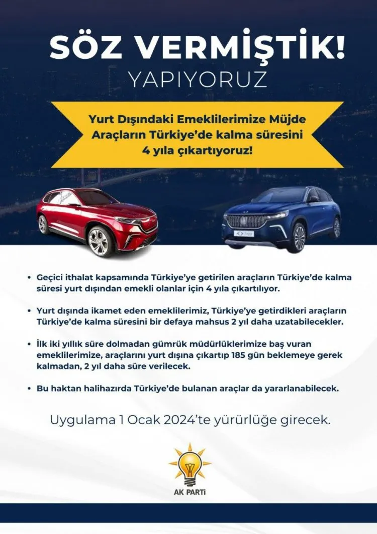 “Yeni yılın ilk müjdesi yurt dışı emeklilerimiz için. Yurt dışından emekli olup uzun süre Türkiye’de kalan vatandaşlarımızın geçici olarak ülkeye getirdikleri taşıtlar için 730 güne kadar süre ve bu sürenin tamamı kullanıldıktan sonra yurt dışından emekli olan vatandaşlarımızın taşıtıyla yeniden yurt dışına çıkış yapmasına gerek olmaksızın bir defaya mahsus olmak üzere 730 güne kadar ek süre verilmesine yönelik düzenlememiz 2024’te yürürlüğe giriyor.”