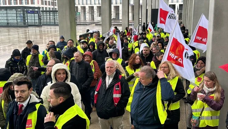Uyarı grevi sebebiyle Berlin-Brandenburg Havalimanı’nda yaklaşık 270 uçuş iptal edilirken, çalışanlar havalimanı önündeki Willy-Brandt Meydanı'nda toplanarak gösteri yaptı.