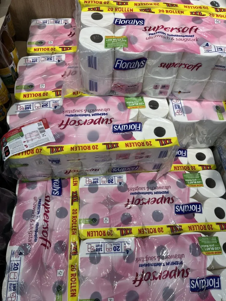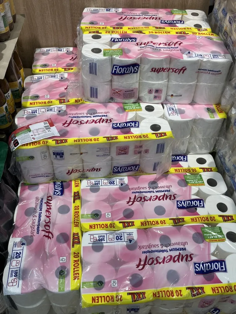 Almanya'nın en büyük süpermarketinde 20'li tuvalet kağıdı 7.99 Euro'ya yükseldi.