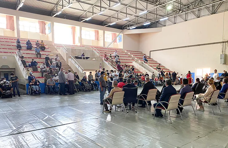 Kampanya kapsamında hayırseverlerin desteğiyle alınan 35 adet akülü, 40 adet manuel tekerlekli sandalye dağıtımı için İzmirlioğlu Fen Lisesi kapalı spor salonunda tören düzenlendi.