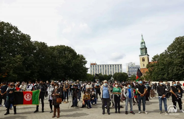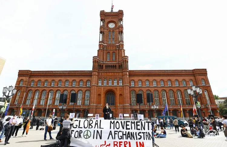 Berlin Büyükşehir Belediyesi olarak kullanılan Kızıl Saray önünde toplanan yaklaşık 500 kişi, burada Alman hükümetine çağrıda bulunarak Afganistan'da kalan ve hayatları tehlikede olanlara kapıların açılmasını istedi.