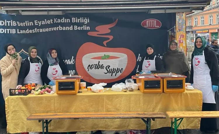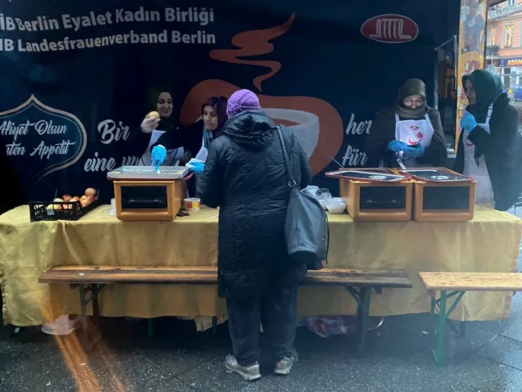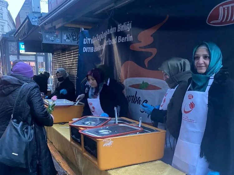 Diyanet İşleri Türk İslam Birliği (DİTİB) Berlin Eyalet ve Kadın Birliği işbirliğinde “Bir Sıcak Çorba Herkes İçin” sloganı ile üçüncüsü gerçekleştirilen etkinlikte kadın gönüllüler, sokaklarda yaşam mücadelesi veren evsizlere ve ihtiyaç sahiplerine sıcak çorba ile pilav ve mevye dağıttı.