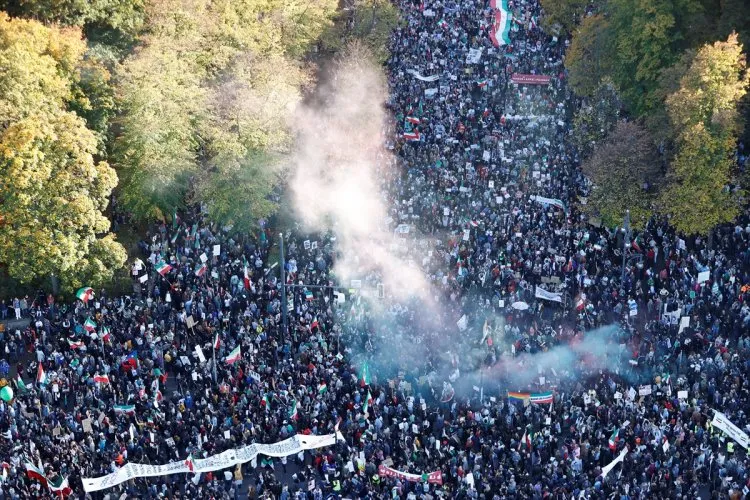 Başkent Berlin'de Zafer Anıtı’nın önünde “Women Life Freedom Kollektiv” inisiyatifinin çağrısıyla toplanan yaklaşık 80 bin kişi, ellerindeki İran bayrakları ve İran rejimini protesto eden döviz ve pankartlarla yürüyüş gerçekleştirdi.