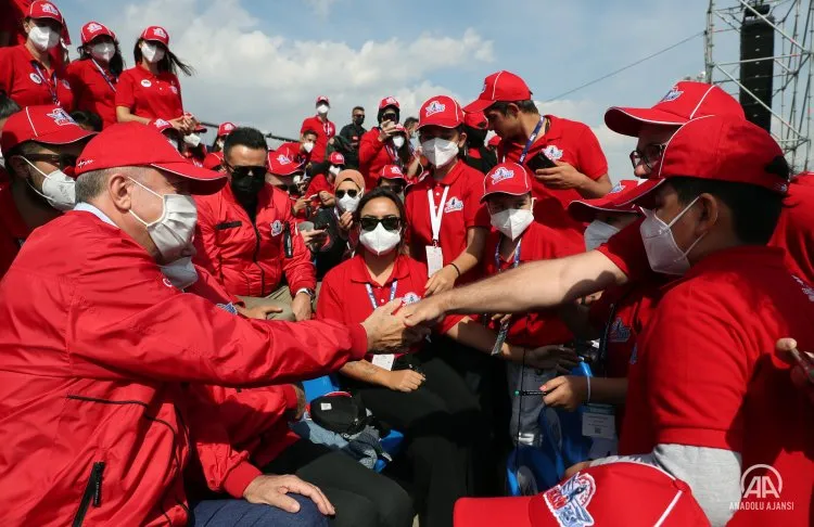 Yine ülkeyi güvenle, huzurla teslim edecekleri pırlanta gibi bir gençlik gördüğünü vurgulayan Erdoğan, "Daha önemlisi gençlerimizin yaşadığı tutkuyu paylaşan mühendis, araştırmacı, girişimci ağabey ve ablaları görüyorum. Türkiye Cumhurbaşkanı olarak hem siz gençlerimizle hem de sizleri en güzel şekilde yetiştiren anne babalarımızla gurur duyuyorum. Rabb'ime şahsıma sizler gibi gençlerle yol yürümeyi nasip ettiği için sonsuz hamdolsun diyorum." diye konuştu.