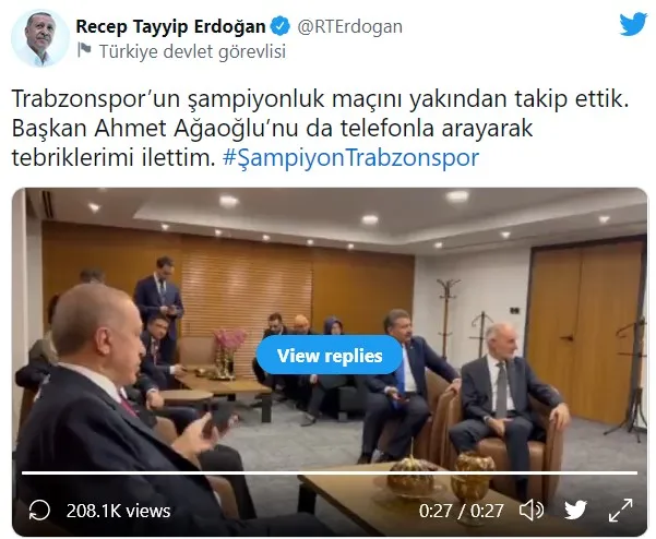 Cumhurbaşkanı Erdoğan, Twitter hesabından yaptığı paylaşımda, "Trabzonspor'un şampiyonluk maçını yakından takip ettik. Başkan Ahmet Ağaoğlu'nu da telefonla arayarak tebriklerimi ilettim." ifadesini kullandı.