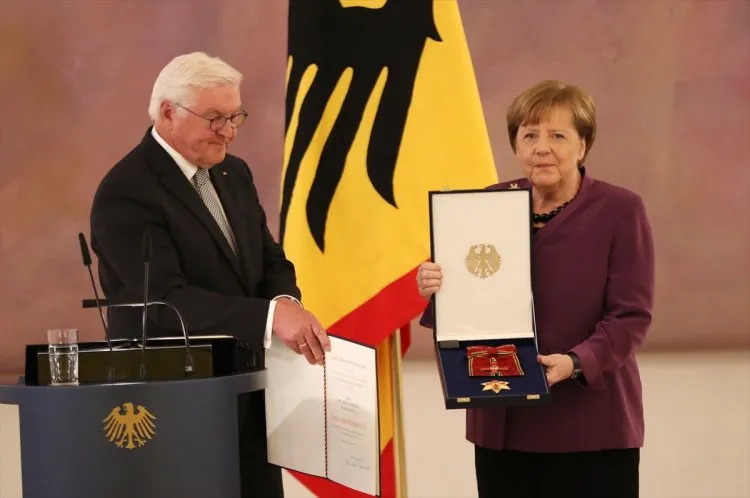 Bellevue Sarayı'nda düzenlenen törende, Cumhurbaşkanı Frank-Walter Steinmeier, Merkel'e özel tasarımla hazırlanan Federal Almanya Cumhuriyeti Liyakat Nişanı'nın Büyük Haçı'nı takdim etti.
