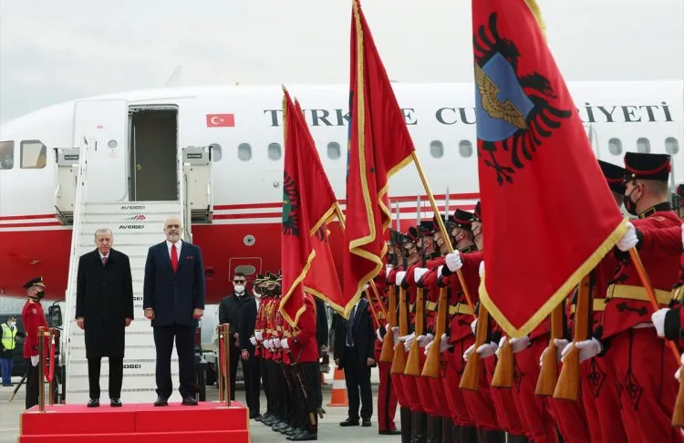 Cumhurbaşkanı Erdoğan ve Rama(sağ 2) daha sonra, Arnavutluk'ta 2019'da meydana gelen deprem felaketinde evlerini kaybeden aileler için Türkiye tarafından inşa edilen konutların teslim törenine katılmak üzere Laç şehrine hareket etti. Erdoğan ve Rama, TOKİ tarafından Laç şehrinde depremzedeler için inşa edilen konutlarda incelemelerde bulundu, örnek daireyi gezdi.