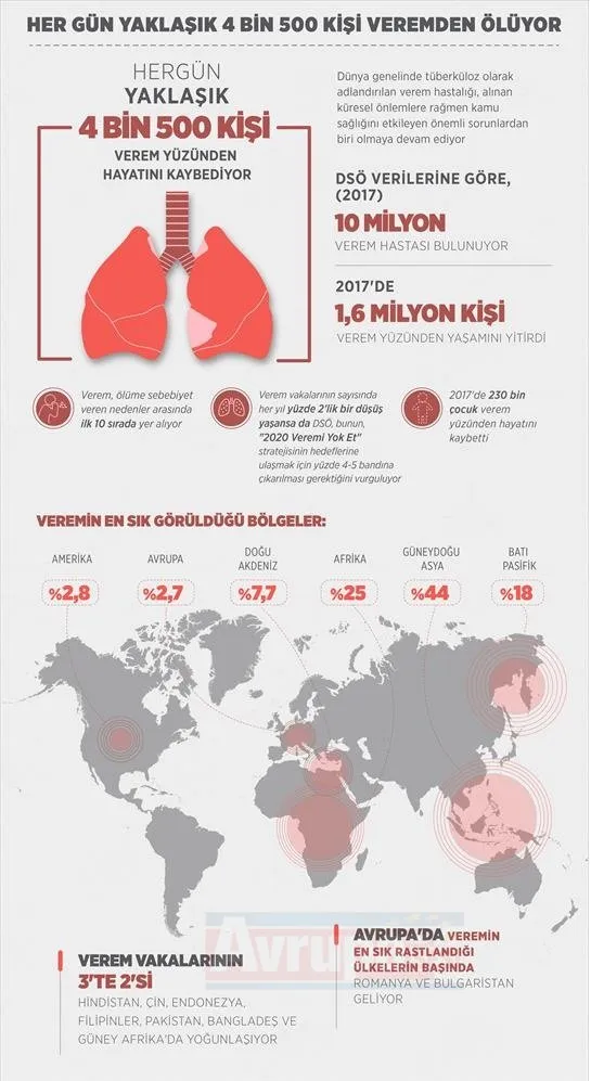 Ölüme sebebiyet veren nedenler arasında ilk 10 sırada yer alan verem hastalığı, tedavisi olmasına ve başta DSÖ olmak üzere birçok kurumun farkındalık artırmayı hedefleyen çalışmalarına rağmen çocuklar dahil çok sayıda kişinin hayatına mal oluyor. Dünyada her gün yaklaşık 4 bin 500 kişi verem yüzünden ölüyor.