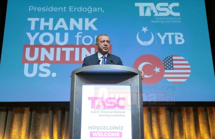 "Bugün New York'ta Amerika'nın dört bir yanından gelmiş kardeşlerimle, vatandaşlarımla, soydaşlarımla kucaklaşmanın coşkusu ve heyecanı içindeyim." diyen Erdoğan, etkinliği düzenleyen Türk Amerikan Ulusal Yönlendirme Komitesi yetkililerine teşekkür etti.