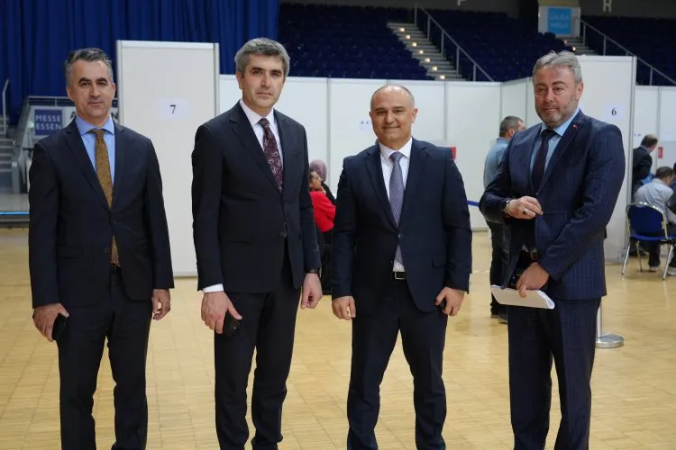 Essen seçim merkezini ziyaret eden YTB Başkan Yardımcısı Adem Günaydın, çalışmalar hakkında Essen Başkonsolosu Taylan Özgür Aydın’dan bilgi aldı.