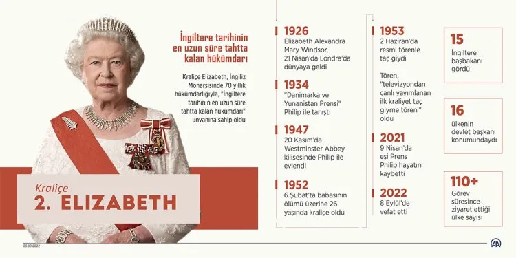 İskoçya'daki Balmoral Kalesi'nde 96 yaşında hayatını kaybeden İngiltere tarihinin "en uzun süre tahtta kalan monarkı" olan Kraliçe 2. Elizabeth, 70 yıllık görev süresi boyunca 15 İngiltere başbakanı gördü.