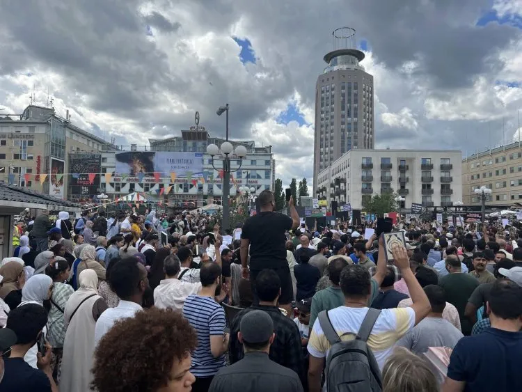İsveç'in başkenti Stockholm'de, Kurban Bayramı'nın ilk günü bir caminin önünde Kur'an-ı Kerim'in yakılması, Stockholm'ün Medborgarepaltsen bölgesinde protesto edildi.