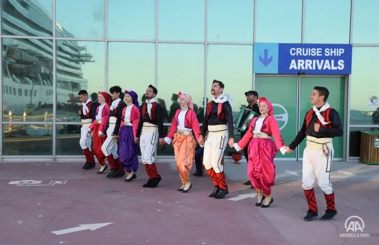 Gemiden inen yolcuları, halk oyunları ekibi ve Kuşadası Belediyesi Bandosu karşıladı.