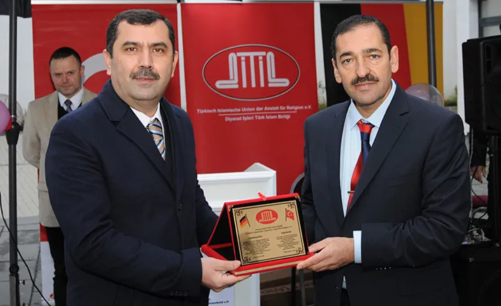 DİTİB Genel Başkanı Kazım Türkmen, caminin yapımı ve hayata geçirilmesinde emeği geçenler adına dernek başkanı Metin Göçer’e plaket takdim etti.