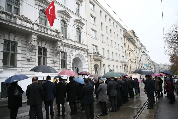 Viyana’da Ermeni teröristlerce şehit edilen 3 Türk diplomatın anısına elçiliğin dış cephesine yapılan plakete çelenk konulmasıyla başlayan törende, saygı duruşunun ardından şehitler için dua edildi.