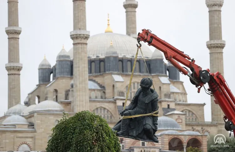 Meydandaki düzenleme çalışmalarını yürüten firmanın görevlileri, sabah saatlerinde önce şahi toplarıyla birlikte Fatih Sultan Mehmet heykelini, ardından da Mimar Sinan heykelini kaidesinden çıkardı.