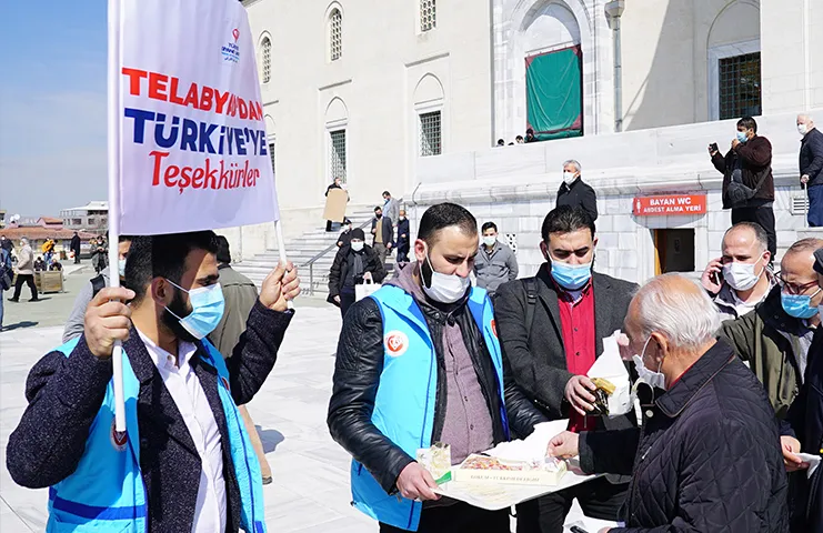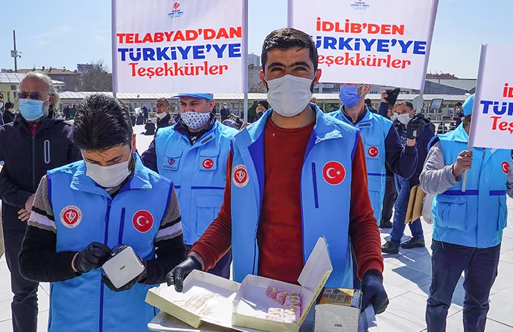 Türkiye Diyanet Vakfının 46. Kuruluş yıl dönümü nedeniyle Cerablus, Telabyad, İdlib, Afrin, Azez, Rasulayn gibi bölgelerden Türkiye Diyanet Vakfının davetlisi olarak Ankara’ya gelen Suriyeli gençler, geldikleri bölgelerin isimleri ve “Teşekkürler Türkiye” yazılı dövizler açarak vatandaşlara lokum ikramında bulundu.