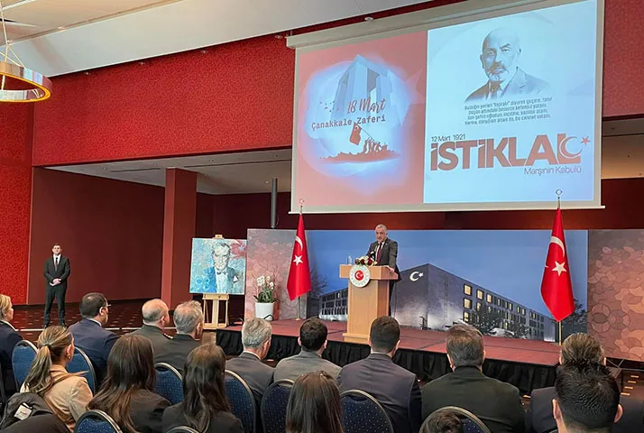 Büyükelçi Şen konuşmasında, Türk Milleti'nin Çanakkale'de istiklal ve vatan uğruna verdiği destansı mücadelenin, Kurtuluş Savaşı'nın fitilini ateşlediğini; Milli Şairimiz Ersoy'un da bu bağımsızlık şuurundan aldığı güç ve ilhamla İstiklal Marşımızı yazdığını vurguladı.