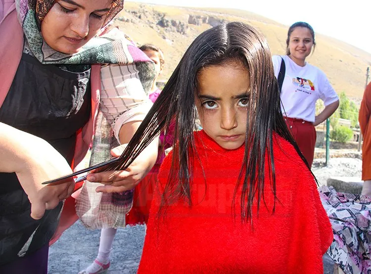 Gönüllü projeye katılan kuaförler eşliğinde erkek çocuklarının saç tıraşını, kız çocuklarına da saç bakımını yapan gençler, gittikleri köylerde okulların kırtasiye malzemesi eksiklerini de gideriyor.