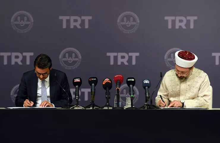 Diyanet İşleri Başkanlığı Konferans Salonunda gerçekleştirilen imza törenine Diyanet İşleri Başkanı Prof. Dr. Ali Erbaş, TRT Yönetim Kurulu Başkanı ve Genel Müdürü İbrahim Eren ile iki kurumdan üst düzey yöneticiler katıldı.