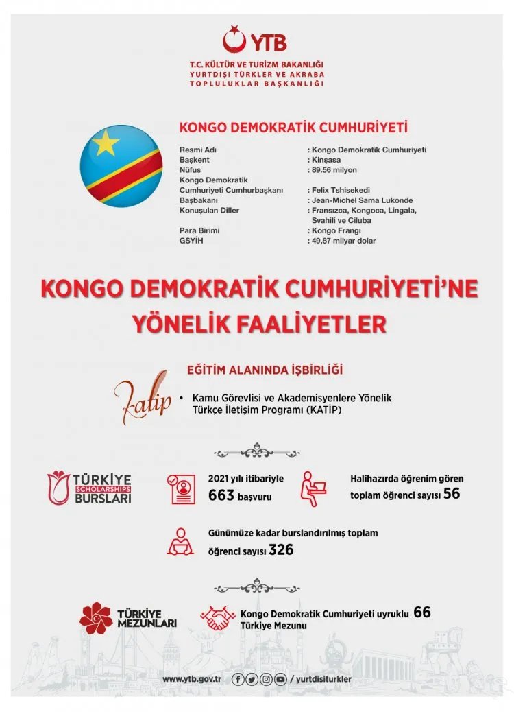 Yurtdışı Türkler ve Akraba Topluluklar Başkanlığı (YTB), Cumhurbaşkanı Recep Tayyip Erdoğan’ın çalışma ziyaretinde bulunacağı; Kongo Demokratik Cumhuriyeti, Senegal ve Gine Bissau'ya yönelik; diaspora, eğitim, akademi, medya ve Türkçe alanlarında projeler yürütürken aynı zamanda ilişkilerin seyrinin gelişimine de katkı sağlıyor.