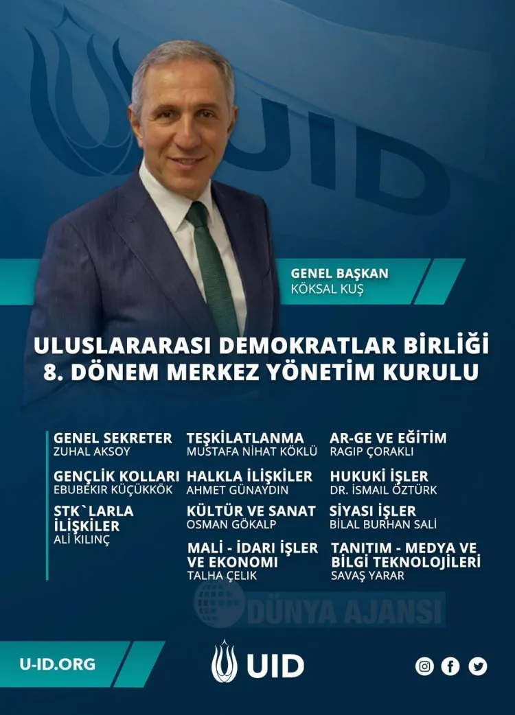 Uluslararası Demokratlar Birliği (UID), 39 kişiden oluşan Merkez Yönetim Kurulu'nun (MYK) belirlediği 8. olağan kongrenin ardından Köksal Kuş başkanlığında yeni merkez yönetim kurulu görev dağılımı yaptı.