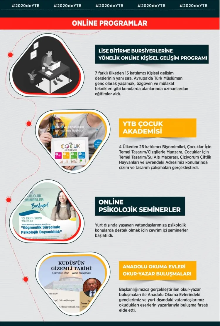 YTB bunların yanında 2020 yılında bir de yurt dışında yaşayan gençlerin potansiyellerini daha güçlü bir biçimde ortaya koyabilmelerini sağlamak ve ilişkilerini profesyonel hayatın gerektirdiği şekilde yürütmelerine yardımcı olmak için “Online Kişisel Gelişim Akademisi”ni başlattı. 7 ülkeden 74 katılımcı genç, kişisel imaj, hitabet, diksiyon, mülakat ve müzakere teknikleri gibi konularda alanında uzman eğitimcilerden dersler aldı. Bu çalışmanın yanında lise bitirme başarı programı bursiyerlerine yönelik de online kişisel gelişim programı hayata geçirildi. Burada da 7 farklı ülkeden 15 katılımcı kişisel gelişim derslerinin yanı sıra, özgüven ve mülakat teknikleri gibi konularda eğitimler aldı.