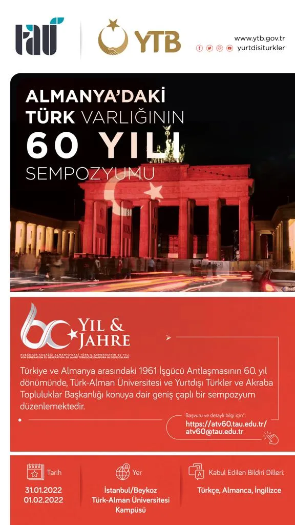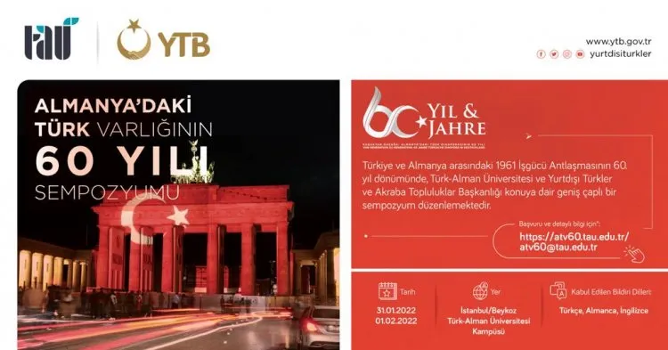 1961 yılında Almanya ve Türkiye arasında imzalanan iş gücü anlaşması neticesinde Türk vatandaşları, Anadolu’nun farklı şehirlerinden misafir işçi olarak Almanya’ya gitti. Almanya’daki Türk varlığının temellerini oluşturulan bu anlaşma ve süreç ile ilgili, Yurtdışı Türkler ve Akraba Topluluklar Başkanlığı (YTB) ve Türk-Alman Üniversitesi (TAÜ) işbirliğinde “Almanya'daki Türk Varlığının 60 Yılı Sempozyumu” programı düzenleniyor. Sempozyum, 31 Ocak -1 Şubat 2022 tarihleri arasında İstanbul’da gerçekleştirilecek.