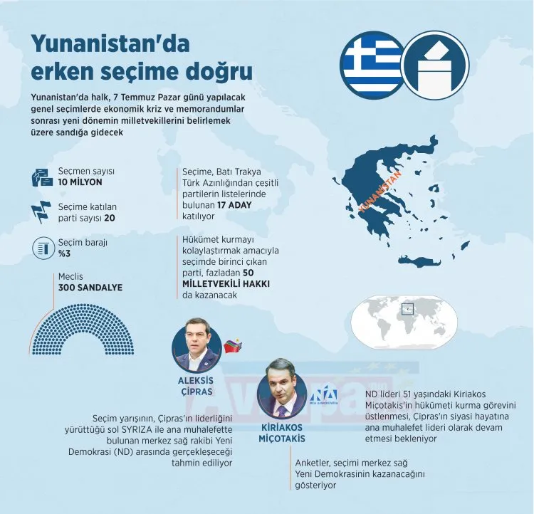 Yunanistan'da pazar günü gerçekleşecek erken genel seçimde yaklaşık 10 milyon seçmen, 300 sandalyeli parlamentoda milletvekillerini belirleyecek. Anketler, seçimi merkez sağ Yeni Demokrasinin kazanacağını gösteriyor.