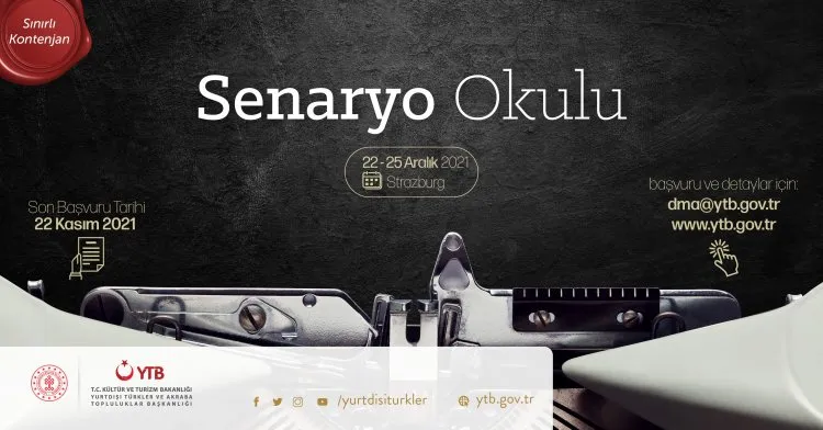 Kültür ve Turizm Bakanlığı Yurtdışı Türkler ve Akraba Topluluklar Başkanlığı (YTB), yurt dışında ikamet eden, sinemacılık alanına ilgi duyan genç vatandaşlara yönelik “Senaryo okulu” düzenliyor. Proje kapsamında temel senaryo eğitimlerinin yanı sıra atölye derslerinde senaryo yazma pratiğini geliştirmeye yönelik çalışmalar da yapılacak. Film, belgesel, kısa film vb. alanlarda içerik üretmek isteyen ve bu alanda içerik üretip başarı kazanmayı düşünen gençler, Senaryo Okuluna davet ediliyor. 22-25 Aralık 2021 tarihleri arasında Strazburg’ta gerçekleştirilecek Senaryo Okulu'ndaki derslerde her adayın yazılı metinler üretmesi teşvik edilerek buna yönelik çalışmalar yapılacak.